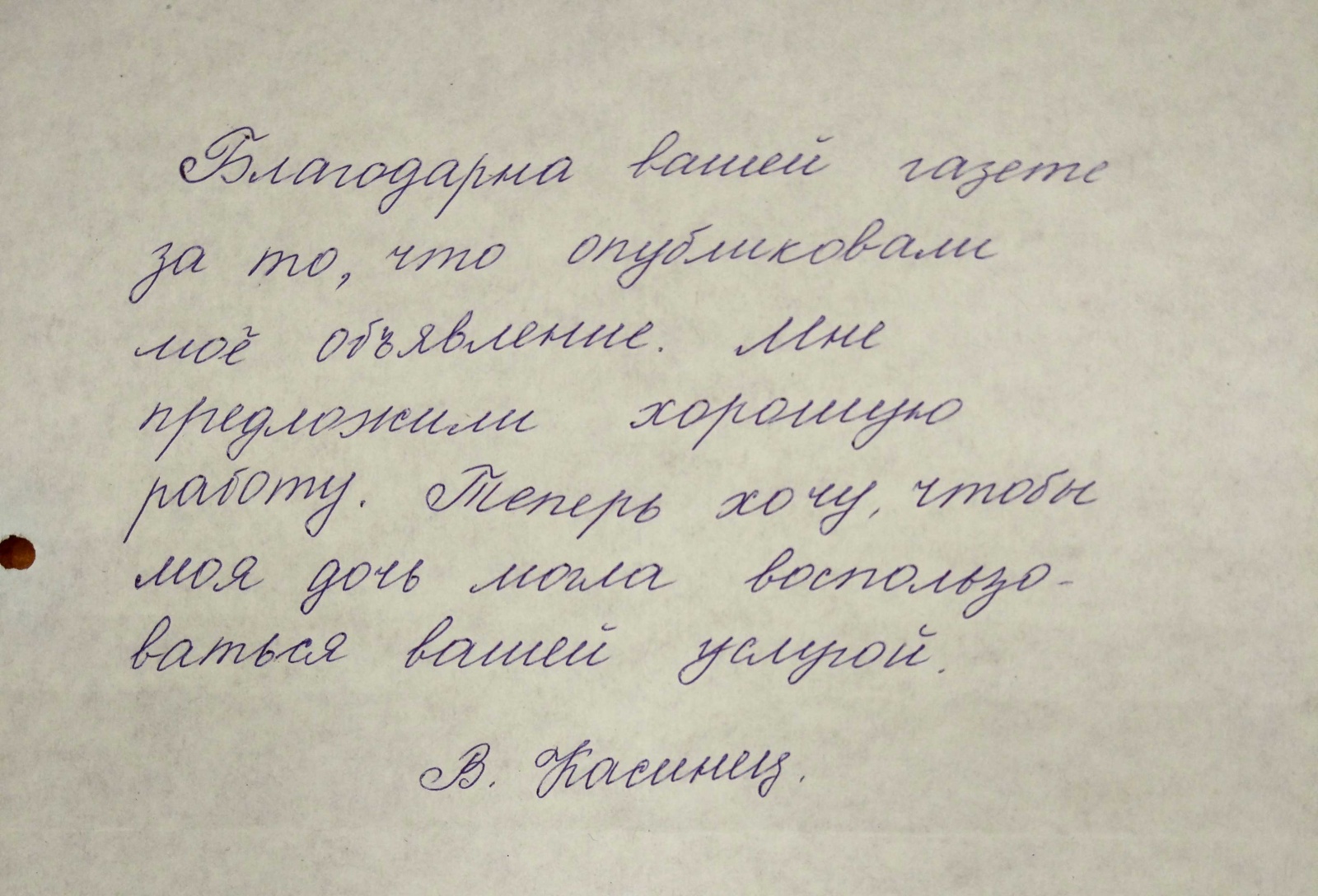 Благодарна вашей газете за то, что опубликовали моё объявление. Мне предложили хорошую работу. Теперь хочу, чтобы моя дочь могла воспользоваться вашей услугой.