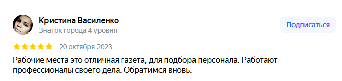 Хотим выразить искреннюю благодарность изданию газеты "Рабочие места" за высокий уровень сервиса и надлежащее качество работы, а также поставить высокую оценку менеджеру Ефремовой Надежде за профессиональный подход, консультации и решение спорных вопросов по размещению рекламы на Ваших страницах. Всегда активная, веселая и доброжелательная, приятно работать.