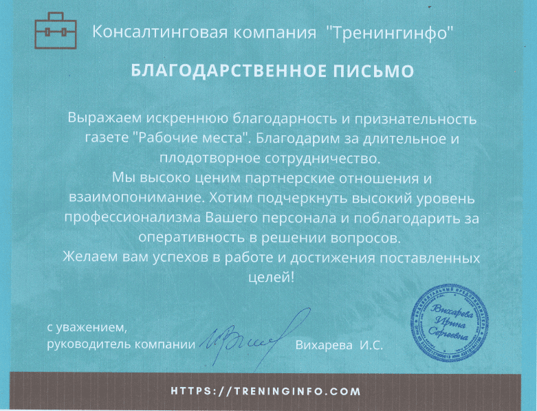 Приятно ощущать свою значимость, ведь менеджеры газеты «Рабочие места» всегда готовы придти на помощь, заблаговременно предупреждают о сроках размещения объявления. Приятная ценовая политика газеты тоже немаловажный фактор в нашем общении. Сотрудничать нравится и мы на все 100% довольным результатами работы с газетой «Рабочие места»